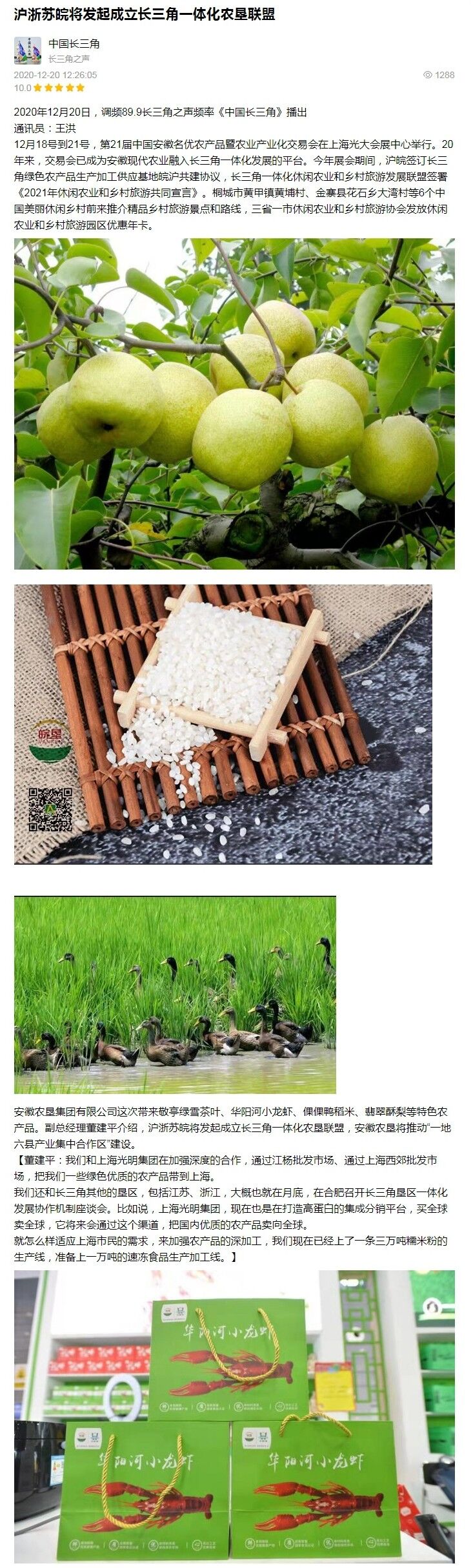 上海新闻广播“长三角之声”:沪浙苏皖将发起成立长三角一体化农垦联盟