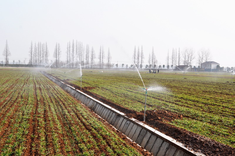 1月9日,开云手机登录入口潘村湖农场小麦良种繁育田的自动喷灌系统正在进行浇水作业。针对近期持续少雨天气,农场按照小麦高产栽培技术规程要求,及时对出现旱情的田块进行节水灌溉,确保3万余亩在地小麦苗齐苗壮、安全越冬。(安徽日报2015年1月10日02版,杨登宏摄)