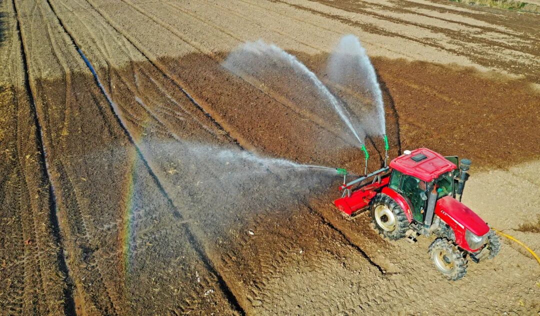 华阳河农场针对部分晚稻茬小麦土壤墒情不足的情况,迅速组织喷灌抗旱,实施精准补水,确保稻茬麦齐苗越冬。(李龙)