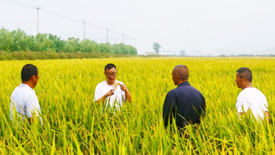 高俊兵向种植大户现场讲解水稻高产栽培技术(邵星星 摄)