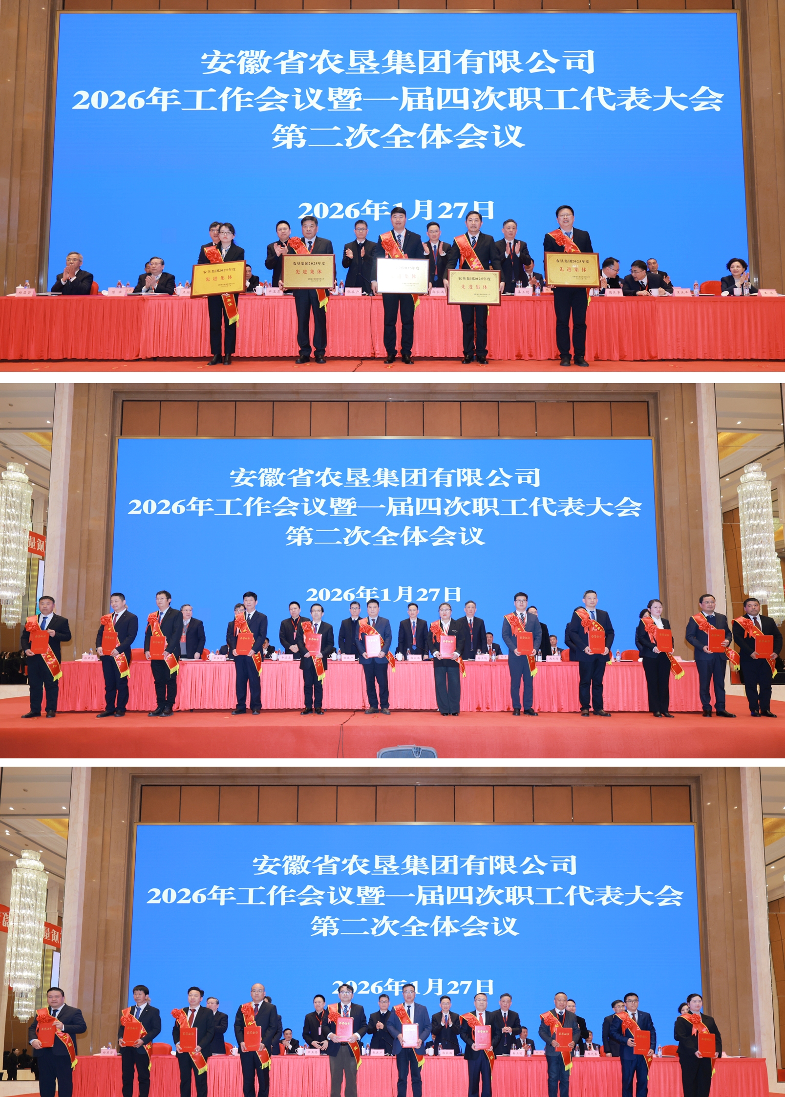 1月27日,农垦集团2026年工作会议暨一届四次职工代表大会在合肥召开。集团党委书记、董事长张其广出席会议并讲话。集团党委副书记、董事、总经理郭家满作工作报告。集团党委委员、职工董事、工会主席姜三豹主持预备会。集团外部董事列席会议,垦区261名职工代表参加会议。