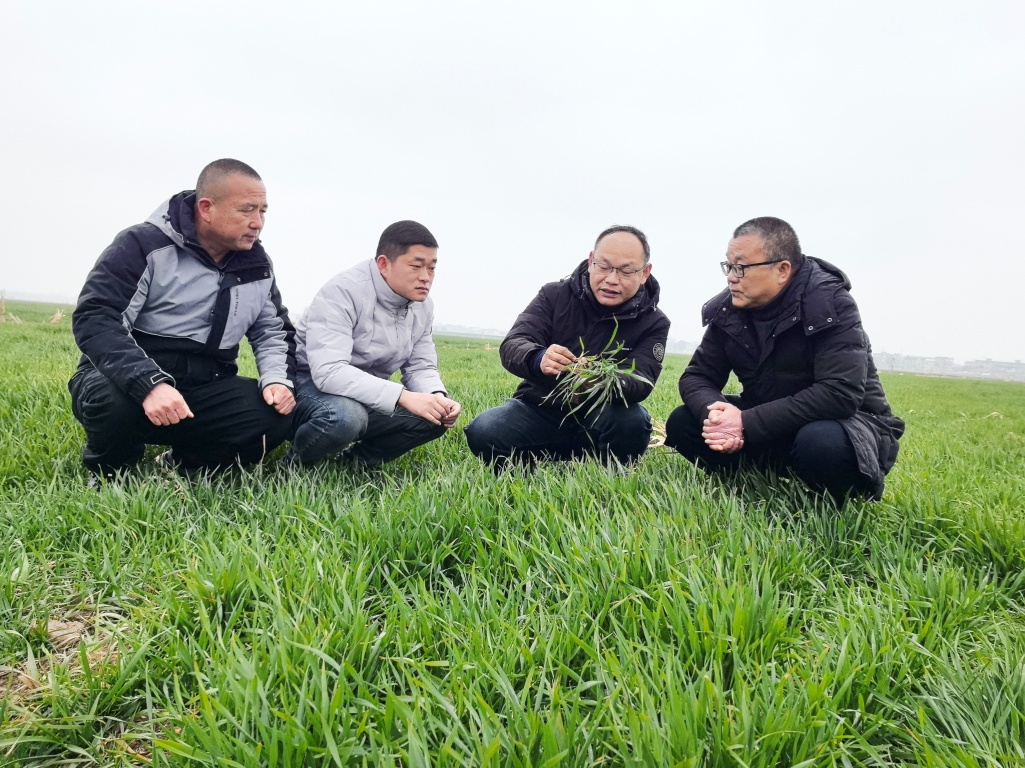 ▲皖河农场农业技术人员在安庆大观区海口镇万亩示范片指导小麦追肥(徐丽燕 摄)