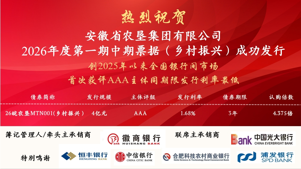 本期中期票据由徽商银行、光大银行联合担任主承销商,募集资金专项用于乡村振兴领域。发行结果显示,本期中票全场认购倍数达4.375倍,市场反响热烈。