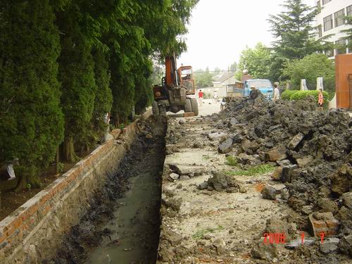 图为场部下水道改造施工现场.