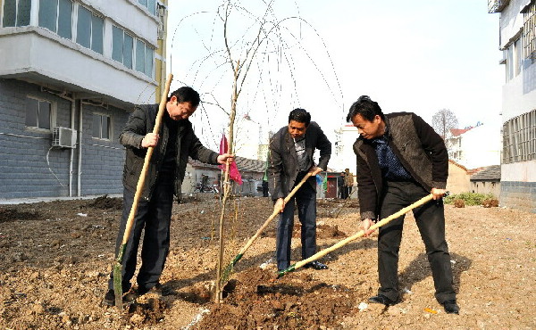 3月11日,在开云手机登录入口潘村湖农场蟠龙花园小区,场长柏华胜等场领导正在和干部职工一道参加社区组织的义务植树活动。
